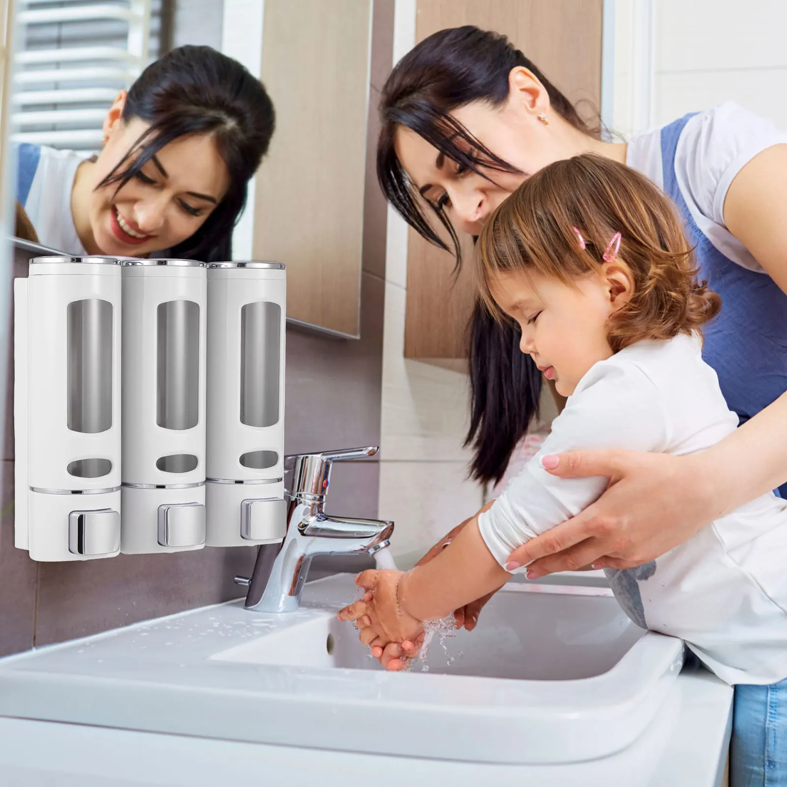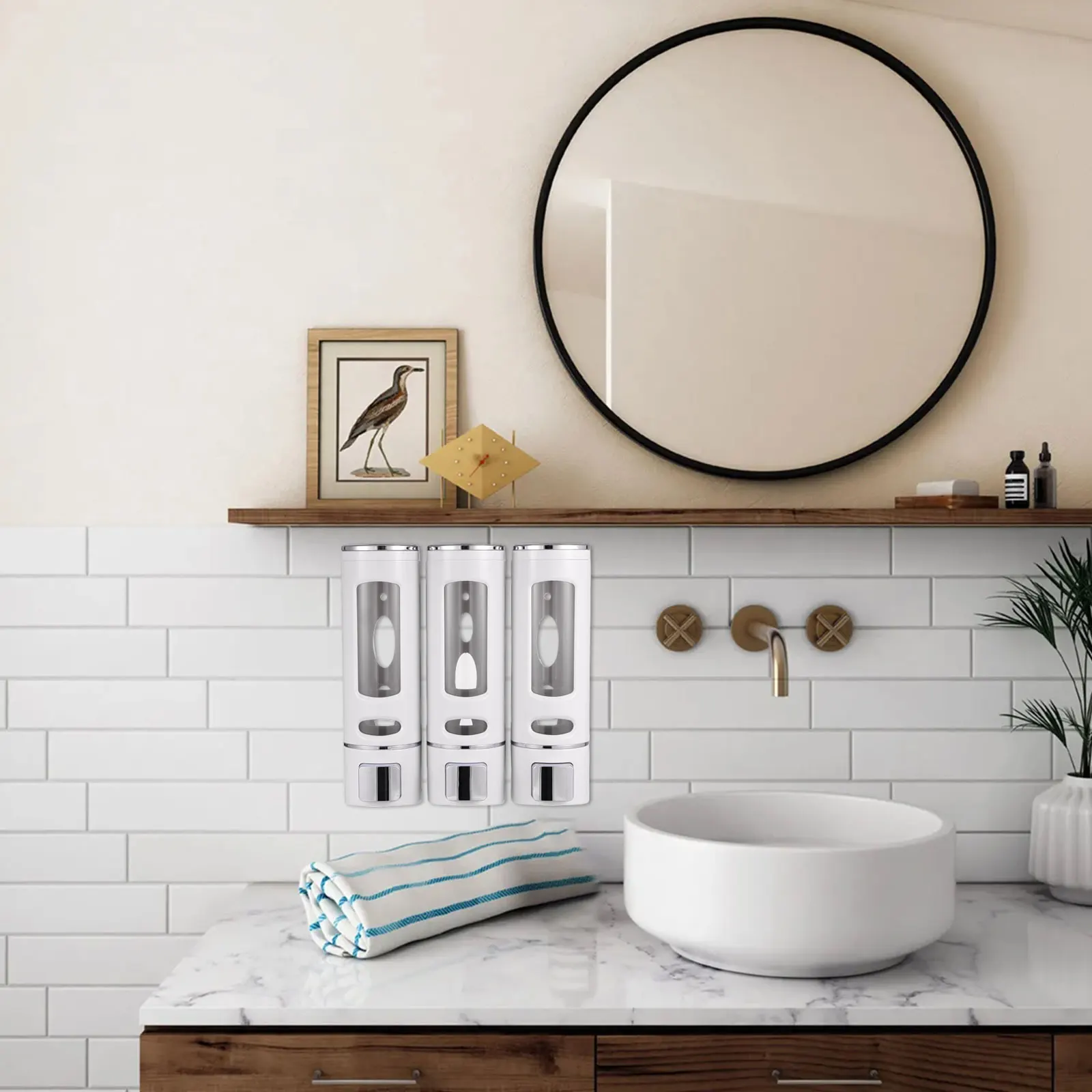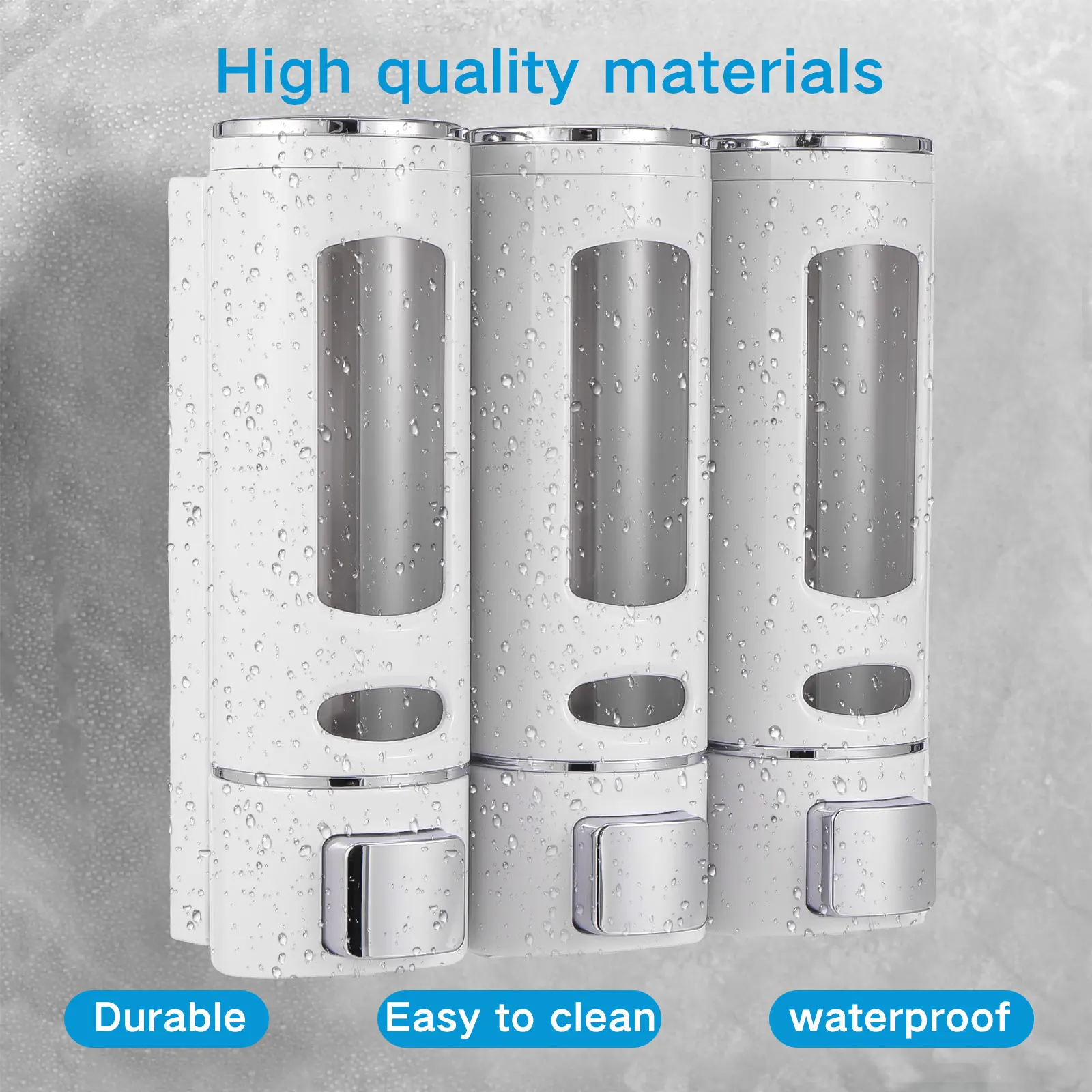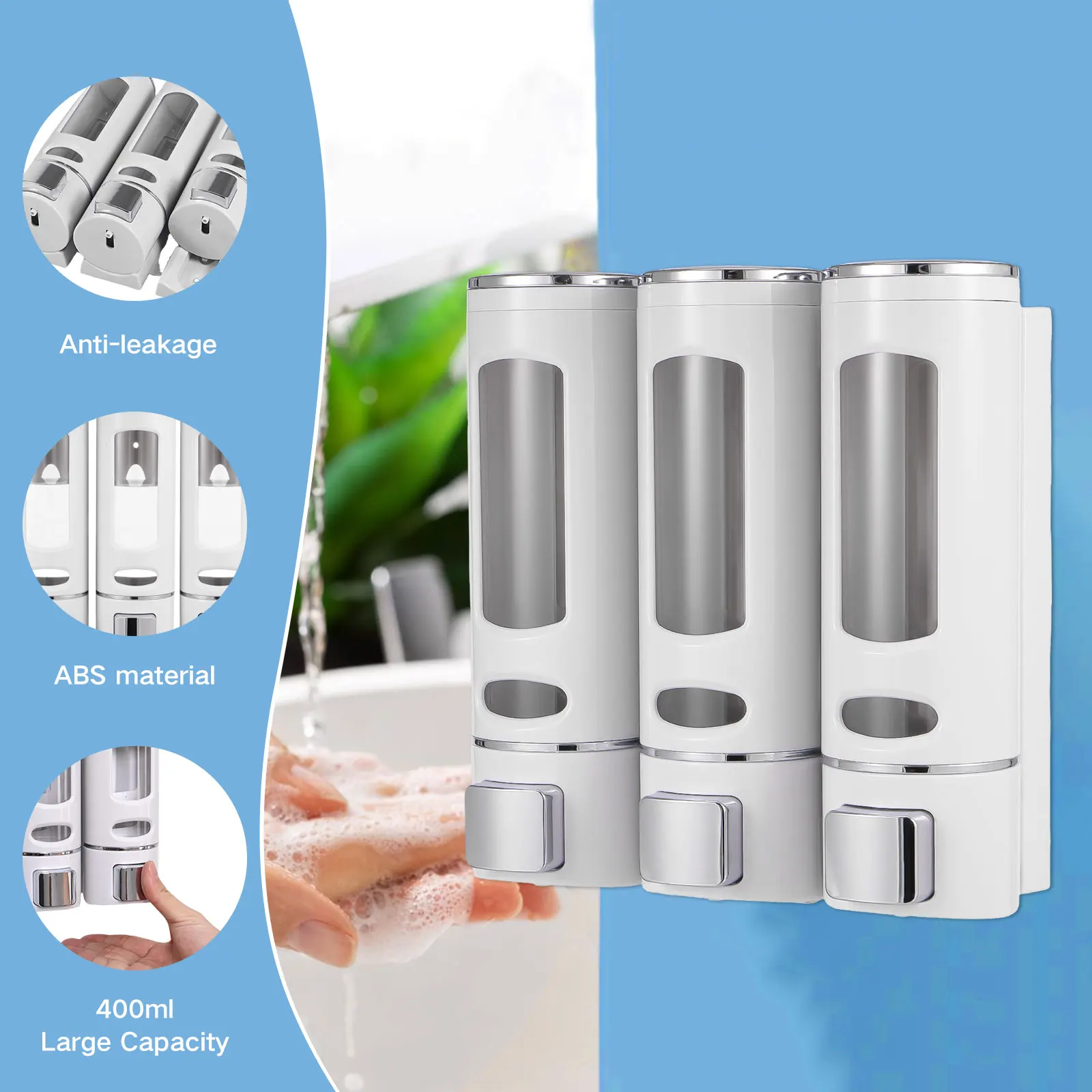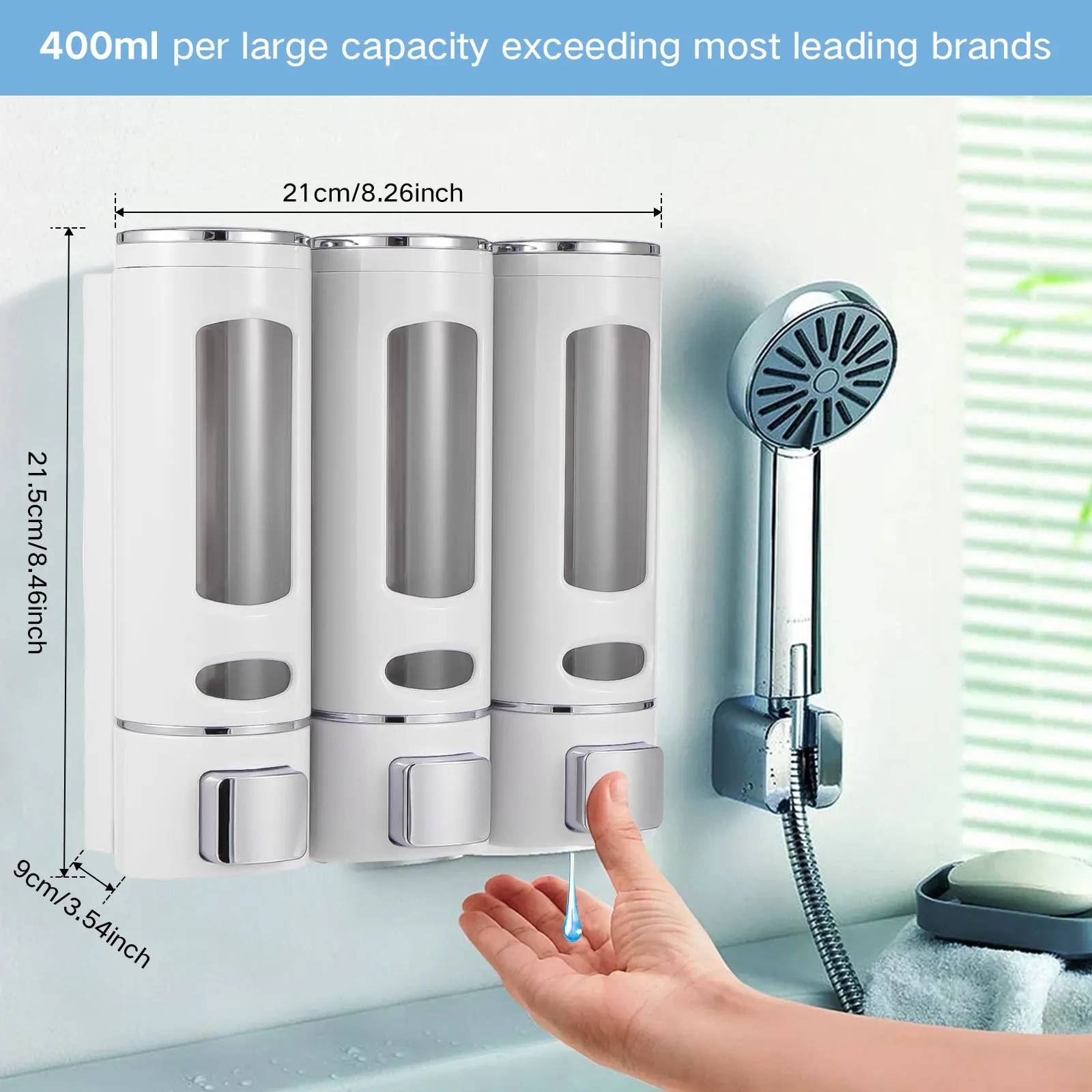 [400ml Shower Soap Dispenser] This soap dispenser set comes in two different sizes, 2 and 3 chambers. The 2-chamber soap dispenser measures 14 x 9 x 21.5 cm / 5.5 x 3.5 x 8.5 inches, and the 3-chamber soap dispenser measures 21 x 9 x 21.5 cm / 8.3 x 3.5 x 8.5 inches. Each soap dispenser has a capacity of 400 ml, which can accommodate a variety of liquids such as laundry detergent, shampoo or conditioner and dispense them at the push of a button. Using these liquid soap dispensers can make your life more convenient.