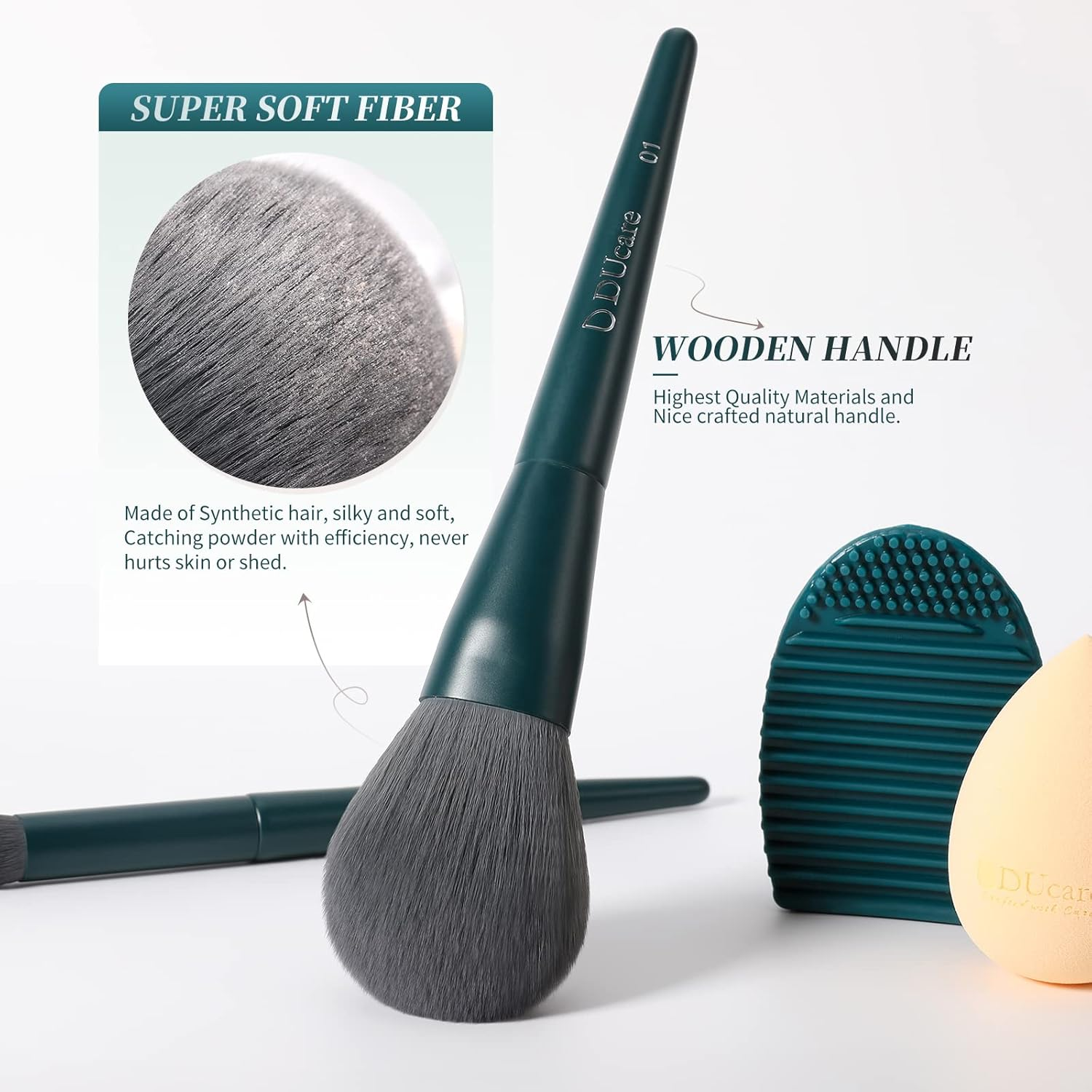 • DUcare makeup brush set containing 17 professional makeup brushes, and 2 FREE BONUS ITEMS: a makeup brush cleaner, DUcare foundation sponge.This makeup brushes set is vegan-friendly, cruelty-free, and made with recycled materials.
