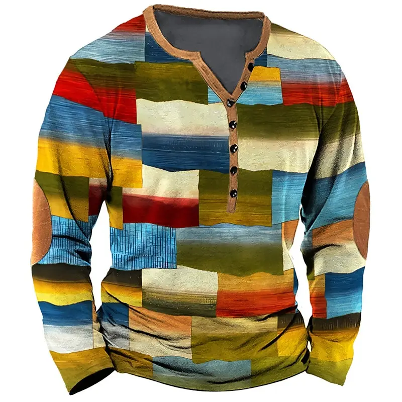 Patchwork Denim Retro Mesh Graphics 3D Printing Men’s Long Sleeve Button T-shirt Spring And Autumn Oversized Man Clothing Top