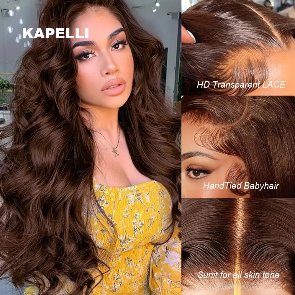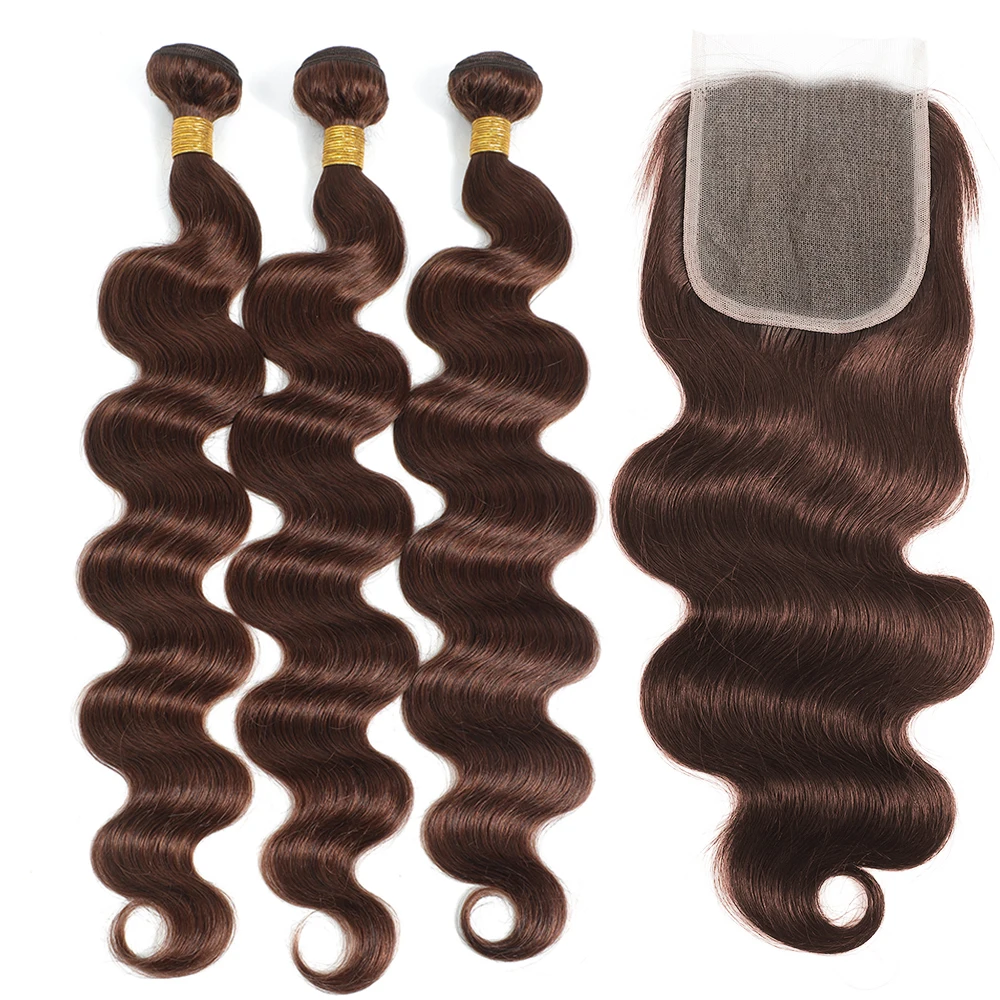 Light Brown Body Wave Bundles with 4×4 Lace Frontal virgin human hair with baby hair, hand-tied swiss lace, match all skin tones, 180% density, no shedding and no tangle; soft and silky, thick and no split ends